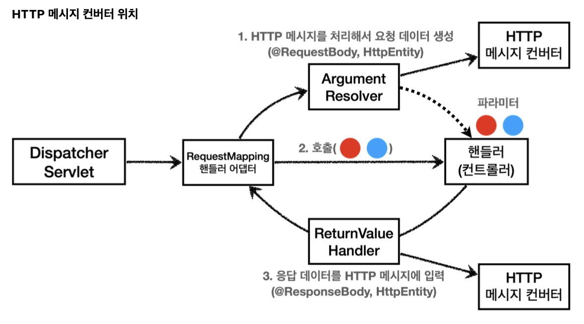 위에서 설명한 Dispatcher Servlet에서 요청을 처리하는 과정을 알아보았다. 근데 결론은 HTML을 랜더링 해서 보여주는 것이었는데, HTTP API처럼 JSON 데이터를 HTTP 메시지 body에서 직접 읽고 처리하려면 어떻게 해야 할까?