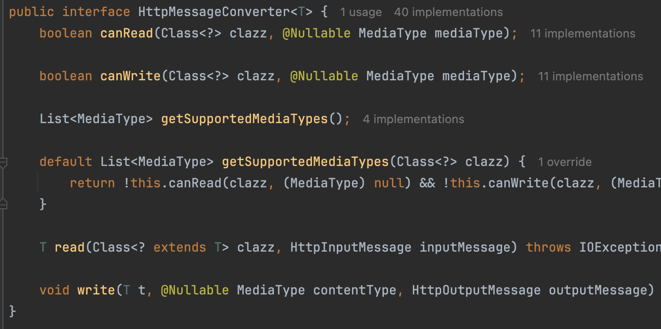 여기에서 중요한 건 canRead, canWrite (메시지 컨버터가 해당 클래스, 미디어 타입을 지원하는지) 그리고 read, write (실제로 메시지 컨버터를 통해 메시지를 읽고 쓰는 기능)이다.