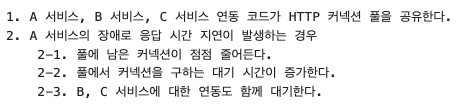 특정 서비스의 장애 때문에 전체 서비스가 영향을 받을 때는 벌크헤드 패턴을 적용해볼 수 있다.