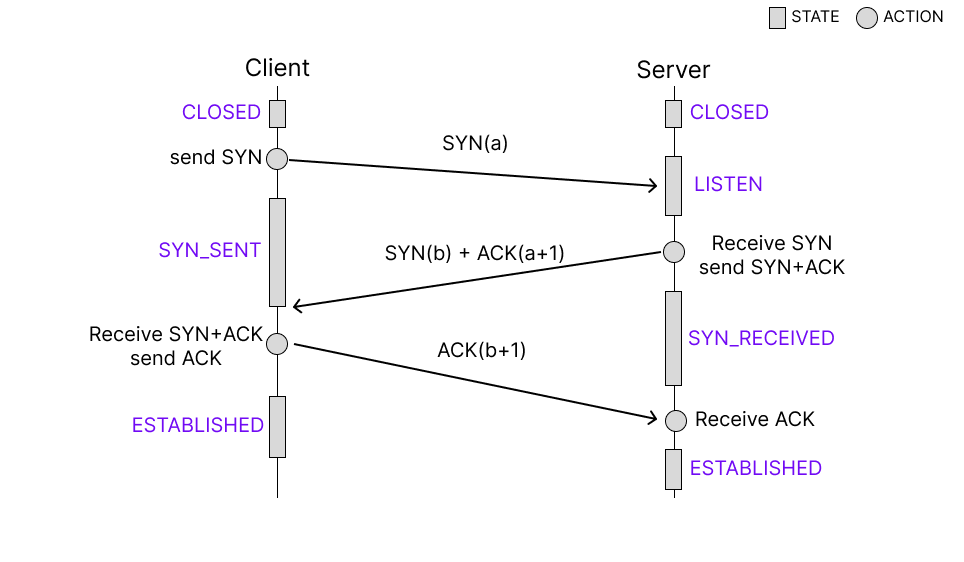클라이언트가 서버에 연결을 요청하기 위해 SYN 플래그를 보낸다. 여기에는 Sequence Number가 포함되어 있다. 클라이언트가 SYN_SENT 상태로 변하고 서버는 LISTEN 상태에서 클라이언트가 보낸 SYN을 받는다. 이에 대한 응답으로 Sequence Number에 1을 더한 값으로 ACK 플래그를 전송하고 서버는 SYN_RECEIVED 상태로 변한다. 다시 클라이언트는 서버가 보낸 ACK과 SYN을 받게 되고 서버가 보낸 SYN 값에 1을 더한 값을 ACK에 담아 보냄으로써 클라이언트와 서버 간에 연결이 성립하게 된다.