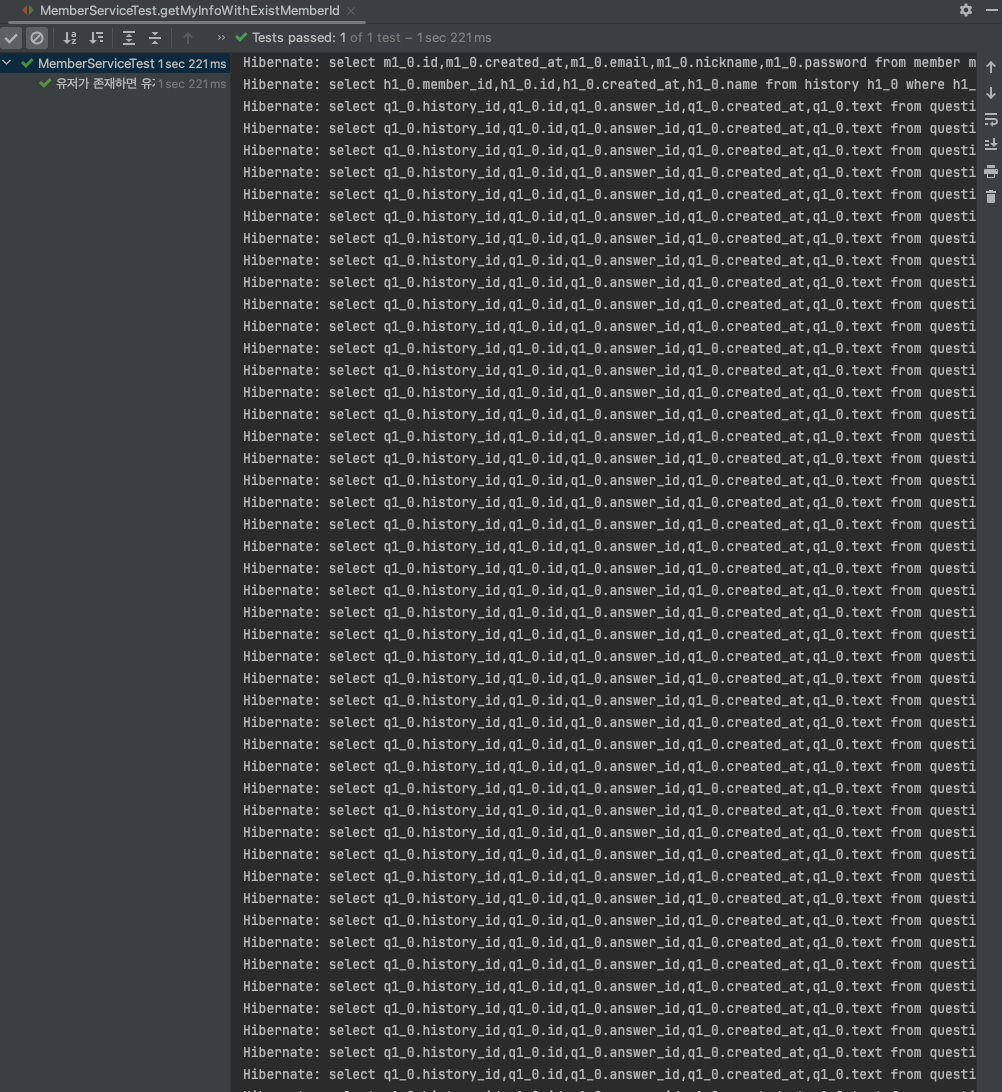 멤버의 history를 구하고 해당 history의 question을 다 구해와서 size를 별도로 구하기 때문에 history에 포함된 question을 다 구하기 위해 쿼리가 history당 1개씩 즉 해당 테스트에서는 100번이나 나간 것이었다.