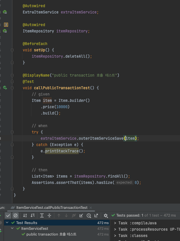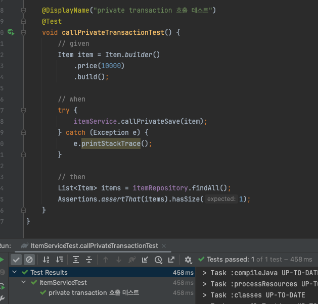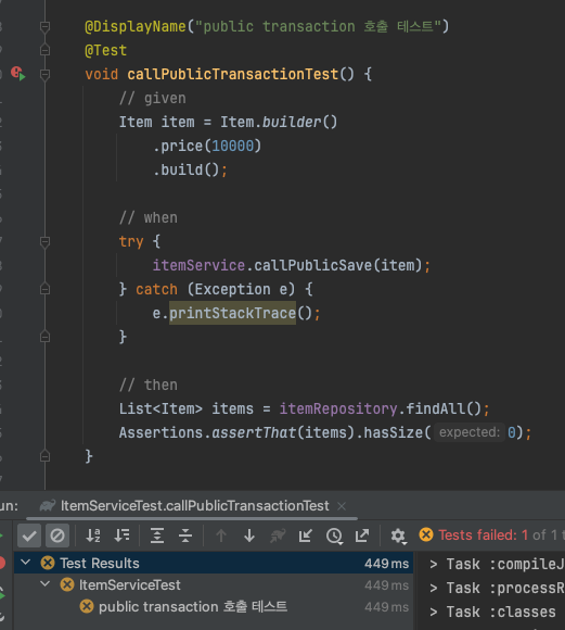 private는 트랜잭션이 실행되지 않을 것이니 save 후 예외가 발생해도 모든 item 조회시 1이 나올것으로 예상할 수 있다. 하지만 트랜잭션이 실행될 것으로 예상했던 public은 조회시 결과가 0이 나오지 않았다. 트랜잭션이 실행되지 않았다는 것인데 이게 어떻게 된걸까?