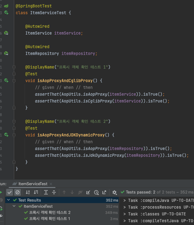 이렇게 각각 인터페이스와 인터페이스가 아닌 itemRepository와 itemService를 검사해보면 무슨 프록시인지 확인해볼 수 있다.