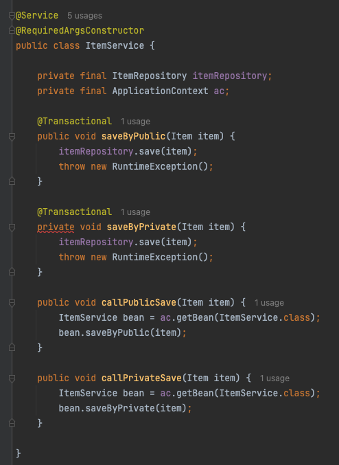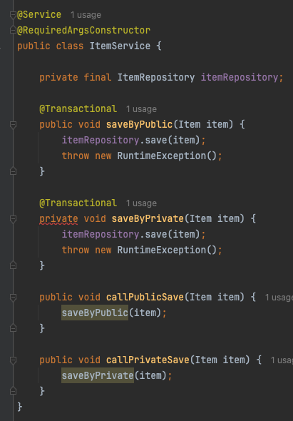 사실 Spring AOP는 외부에서 프록시 객체를 통해 메서드가 호출될 때만 AOP 어드바이스를 적용 즉 트랜잭션을 적용하므로 같은 클래스 내에서 메서드를 호출(self invocation)하면 프록시를 거치지 않고 직접 호출되므로 트랜잭션 어드바이스가 적용되지 않는다. 위의 서비스 코드에서 publicSave와 privateSave를 호출하기 위해 callByPublic, callByPrivate 메서드를 public으로 설정하고 자기 자신의 메서드를 호출하게 했으므로 위와 같은 결과가 나타난 것이었다.