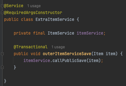 이렇게 ItemService를 또 하나의 ExtraItemService로 묶어버리면 프록시가 생성되고 AOP가 제대로 적용되어 트랜잭션이 잘 작동한다.