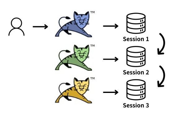 예를 들어 유저의 요청으로 유저의 세션 아이디가 서버 WAS1의 세션 저장소에 저장된다. 하지만 그 후 유저의 요청이 서버 WAS2로 보내진 경우 WAS2의 세션 저장소에는 유저의 세선 정보가 존재하지 않기 때문에 데이터 불일치 문제가 발생한다. 이를 세션 불일치 문제라 하고 이는 크게 3가지 방식(스티키 세션 방식, 세션 클러스터링 방식, 스토리지 분리 방식)으로 해결할 수 있다.