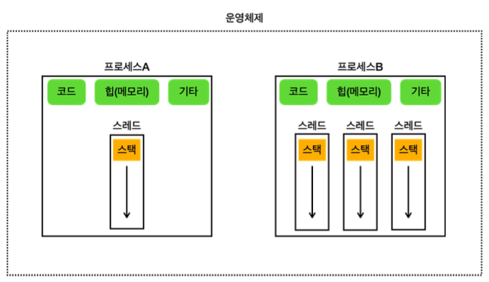 스레드는 프로세스 내에서 실행되는 작업의 단위로, 그림에서 보이듯이 프로세스는 항상 하나 이상의 스레드를 포함한다. 같은 프로세스 내의 스레드들은 프로세스의 메모리 공간(코드, 힙, 기타)을 공유하며 스택의 경우 각 스레드에 각각 존재한다.