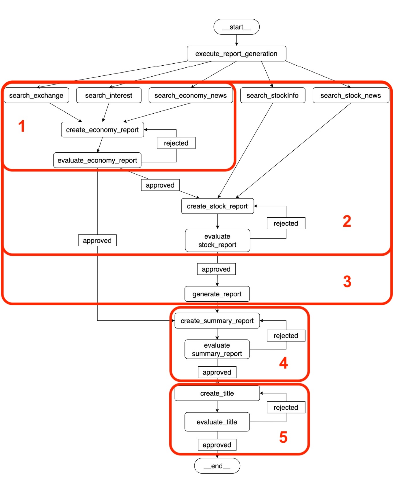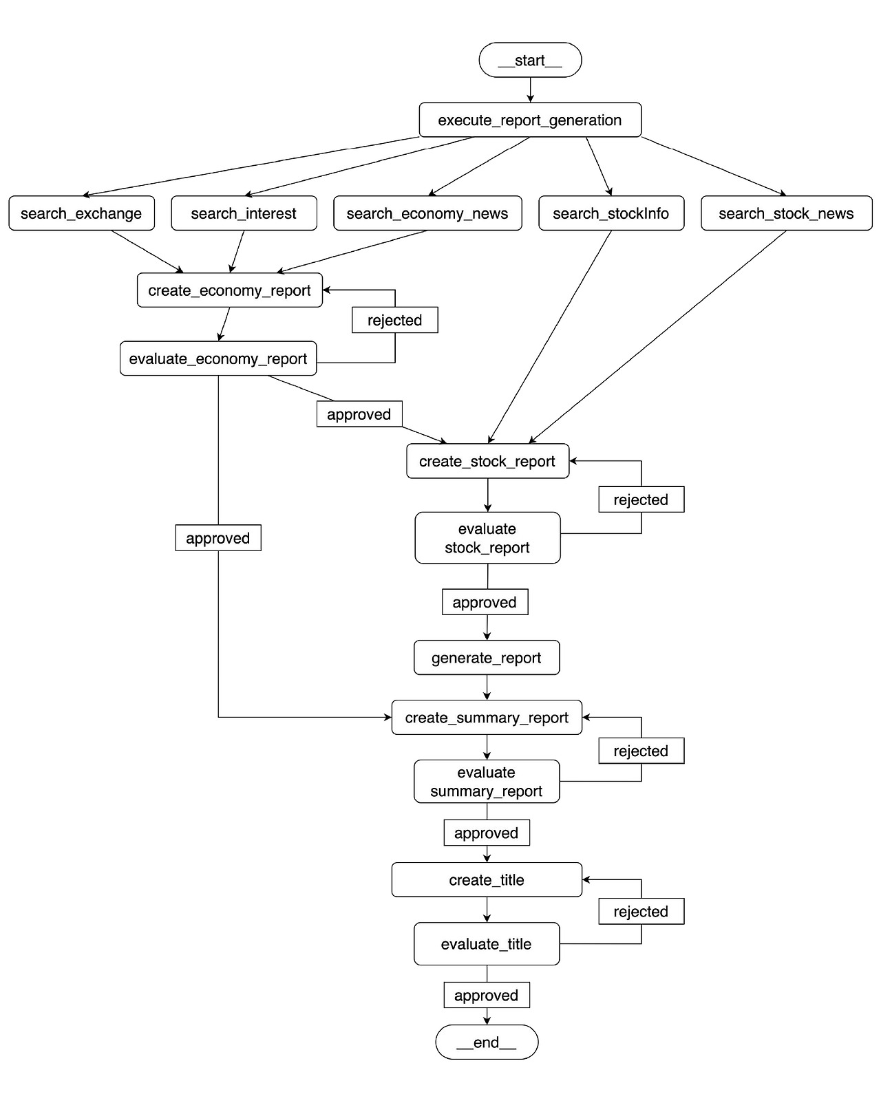그리고 만들어진 경제 리포트와 주가, 주식 뉴스를 합쳐 주식 리포트를 생성합니다. 이 친구도 최대 3번까지 LLM as a judge 방식을 통해 평가됩니다.