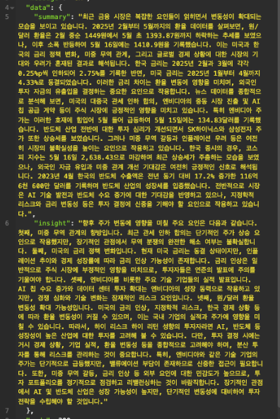 그리고 만들어진 경제 리포트와 주가, 주식 뉴스를 합쳐 주식 리포트를 생성합니다. 이 친구도 최대 3번까지 LLM as a judge 방식을 통해 평가됩니다.